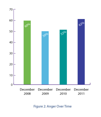 Also, 62 percent of people surveyed described themselves as angry or very angry about the current economic situation. “This is the highest level of anger we’ve measured since March 2009,” said Sapienza. “In an election year, this certainly indicates the importance of the economy to the political agenda.”