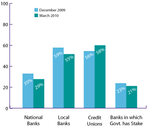 In the first quarter of 2010, the Financial Trust Index was at 23 percent, down 2 percent from last quarter’s revised figure. According to the authors, most of this negative change is attributable to banks, which have experienced a steady decline in trust following the stress test process which launched during this time.