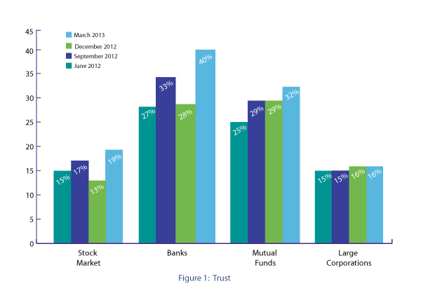 ABOUT THE SURVEY: On a quarterly basis, the Financial Trust Index captures the amount of trust that Americans have in the institutions in which they can invest their money. The survey is conducted by Social Science Research Solutions (SSRS) as part of their weekly national telephone survey, EXCEL. In the most recent wave, a total of 1,012 individuals were surveyed by live interviewers (not IVR) March 20 to March 27, 2013. The institutions considered in the survey are banks, the stock market, mututal funds and large corporations.